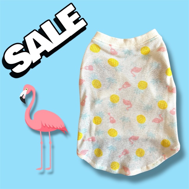 === SALE!!開催中 === ¥1,800 ⇒ ¥1,000 ワンちゃん用のメッシュランニング(フラミンゴ)です。 通気性のあるメッシュで、伸縮性が高く、とても柔らかいニット生地を使用しております。 冷房での冷え防止や肌寒い日にも着用できます。 ---洋服サイズ--- ※ワンちゃんのヌードサイズから約2~4cmほど余裕をもったサイズを お買い求めください。 ※Mサイズは完売致しました。 ●Sサイズ 首回り:約23cm 胴回り:約35cm 着丈:約25cm 前丈:約18cm ---送料--- 1着ご購入の場合:スマートレター(¥210) 2着以上ご購入の場合:レターパックライト(¥430) 3着以上ご購入の場合:宅急便コンパクト(¥600)