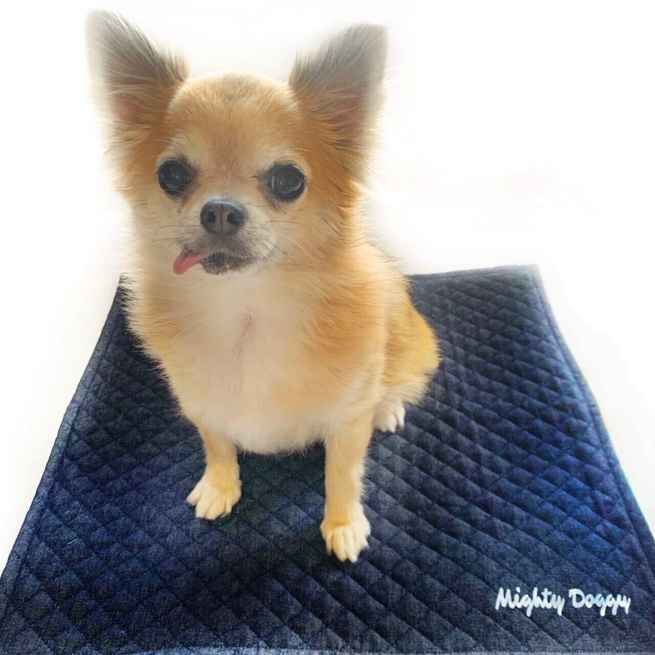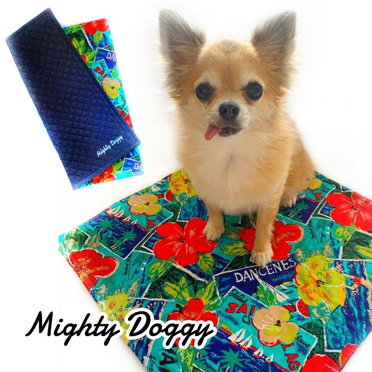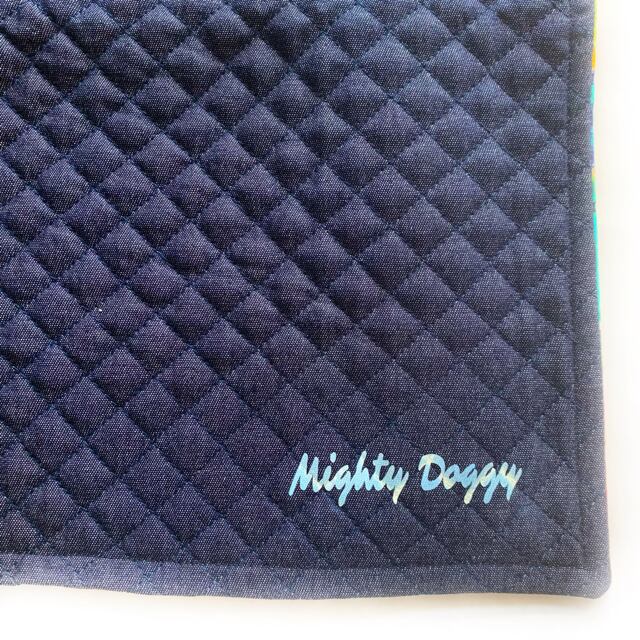 表はハイビスカス柄、裏はネイビーブルーのデニム調キルティング生地のリバーシブルとなっております。